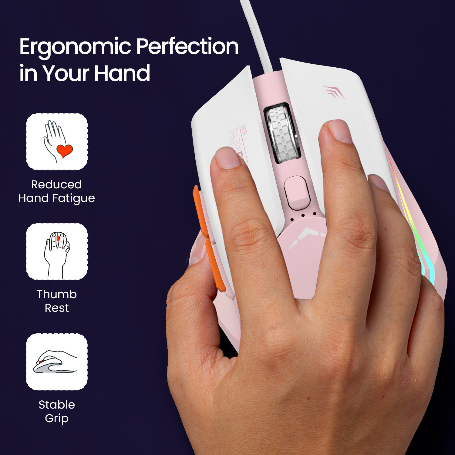 Specifications General Model Name Vader Gaming Mouse with 6 Buttons, Thumb Support, RGB Lights, Max 6400 DPI System Requirements Windows & Mac OS Form Factor Ambidextrous Sales Package Mouse 1N Color Pink